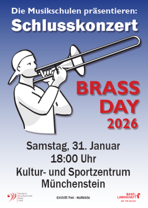 Die Musikschulen des Kantons Baselland mit den benachbarten Musikschulen MUSOL, Dornach und dem unteren Fricktal, laden ein zum ersten Brass Day vom Samstag, 31. Januar 2026. Nach einer musikalischen Begrüssung der teilnehmenden Musikschulen, leiten am Vormittag namhafte Musikerinnen und Musiker instrumentenspezifische Workshops.