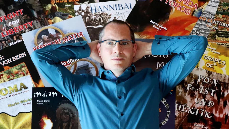 Wer selbst Blasmusik macht, hat den Namen Mario Bürki mit grosser Wahrscheinlichkeit schon einmal auf einem Notenblatt gesehen. «Komponieren ist mittlerweile meine Haupttätigkeit», sagt der 48-jährige Zäziwiler im Gespräch mit der SRF Musikwelle. Er arbeitet zudem in einem Musikverlag und ist als Dirigent und Juror tätig.