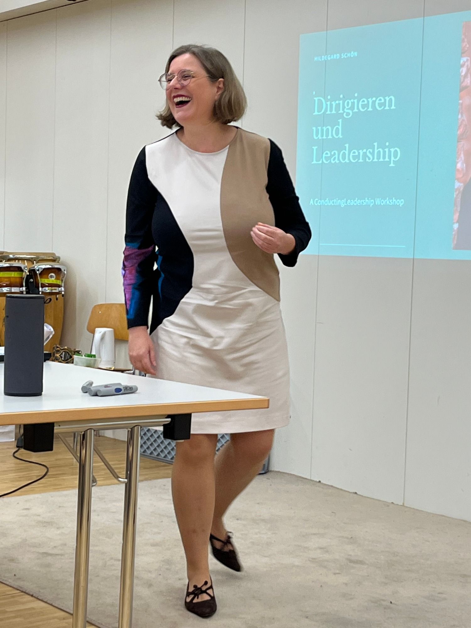 In ihrem fulminanten Referat knüpfte die profilierte Dirigentin, Dozentin und Mentorin nahtlos an die Thematik des ersten Referats an. Die Beantwortung der Frage «Wer bin ich?» führe zum «Selbst-bewusst-sein», welches zusammen mit der persönlichen Energie Authentizität ergibt. Dirigieren ist Führen, und nur als authentische Personen können wir führen: Imitierte Dirigierbewegungen beispielsweise lassen uns lächerlich erscheinen und unbefriedigt zurück.