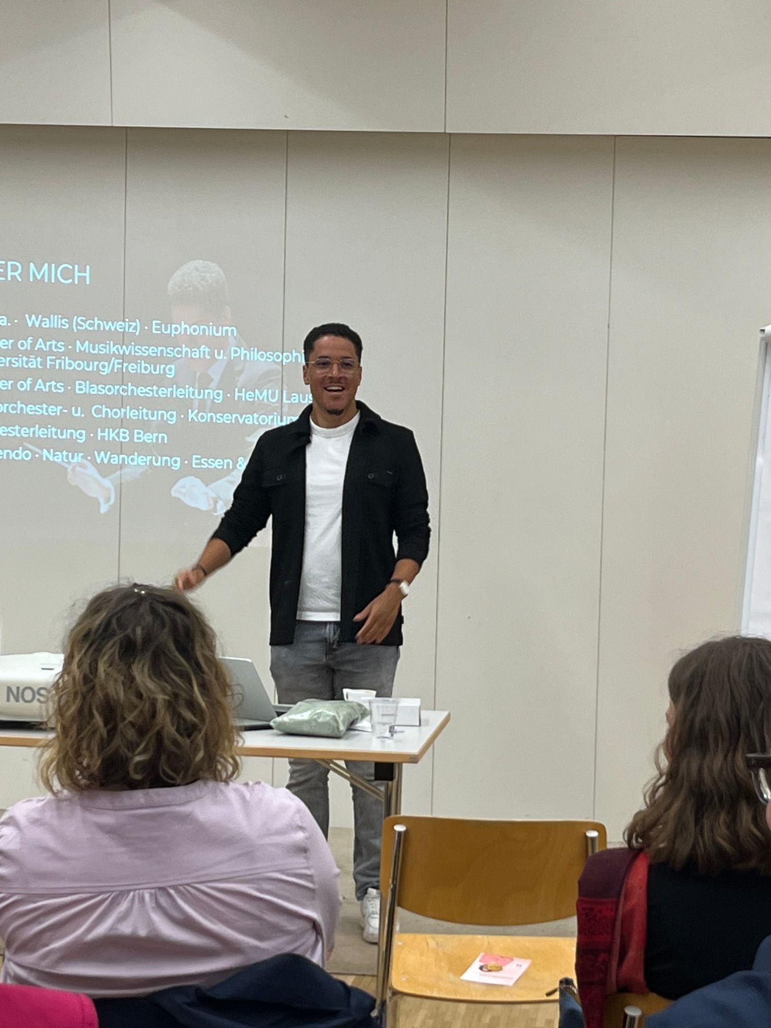 Nach der Mittagspause stellte der junge Westschweizer Komponist mit viel Charme und Esprit eine Reihe von Werken vor, welche er in den letzten Jahren erschaffen hat. Mit klingenden Beispielen und Einblicken in die Partituren konnte man die erstaunliche Vielfalt seiner Kompositionen kennenlernen: Die vorgestellten Eröffnungsstücke, Konzertmärsche, sinfonischen Dichtungen und Ouvertüren zeugten von grosser Kreativität, profunder Auseinandersetzung mit dem Material, vielfältigem Stilbewusstsein und musikalischem Humor.