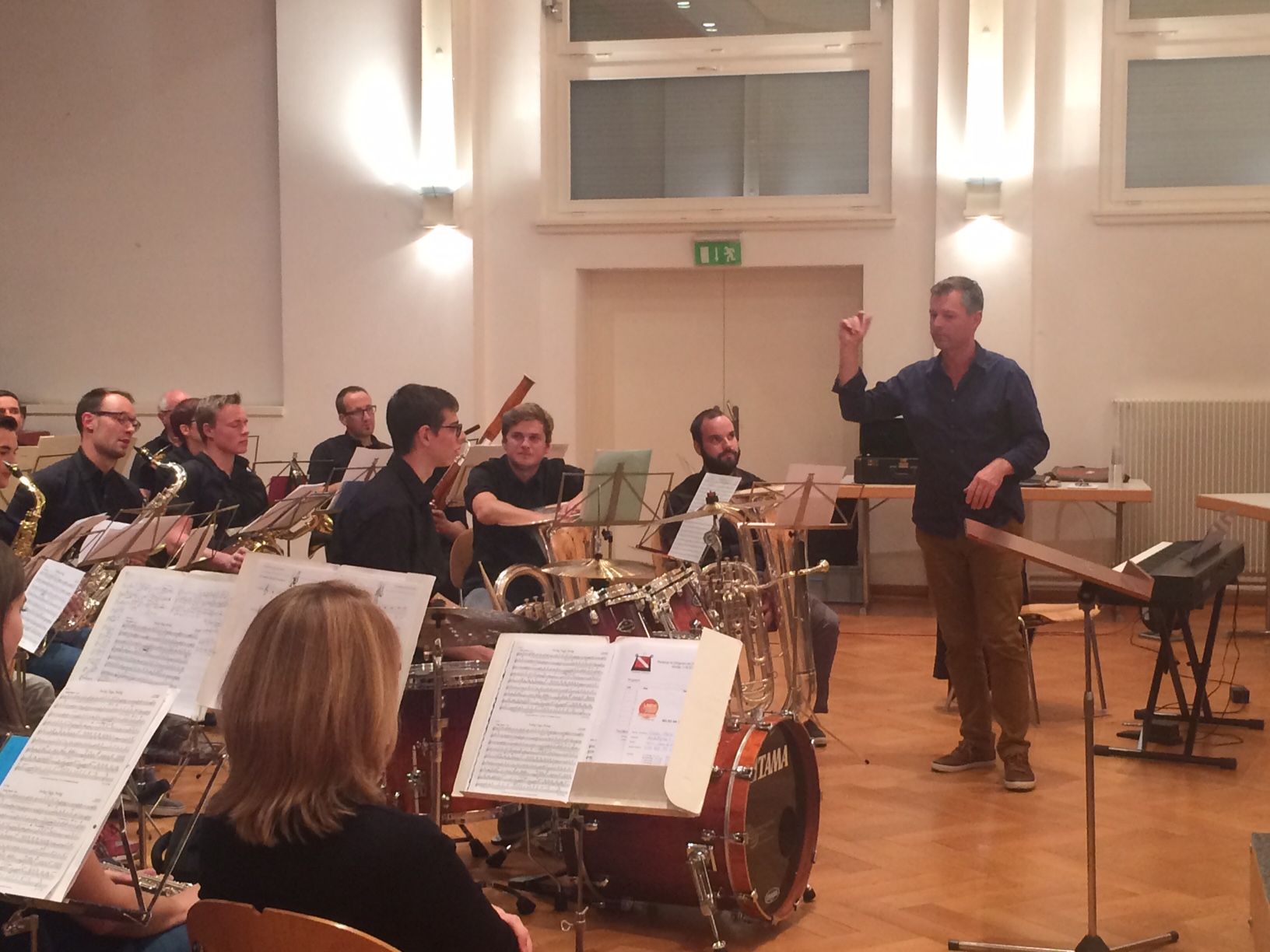 Immer wieder setzt Walter diese und andere Tipps mit dem Orchester praxisnah um, und die Seminarteilnehmer können live erleben, wie wichtig gezielte Instruktionen sind. Beim Vorsingen der Patterns rät Walter, instrumentenbezogen zu agieren, damit die Instrumentalisten dies technisch auch umsetzen können.