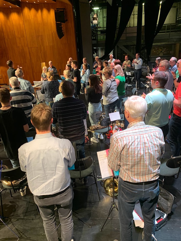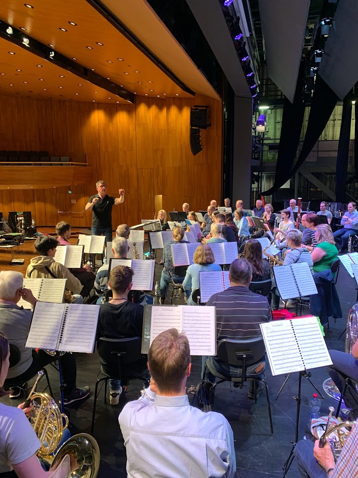 Peter erklärt vor dem angekündigten Durchspiel des ersten Stückes alle Details im Ablauf (wo wird wie dirigiert, wo muss wer worauf aufpassen). Dann wird gespielt. Die weiteren Stücke probt er oft von hinten nach vorne, was viel bringt.