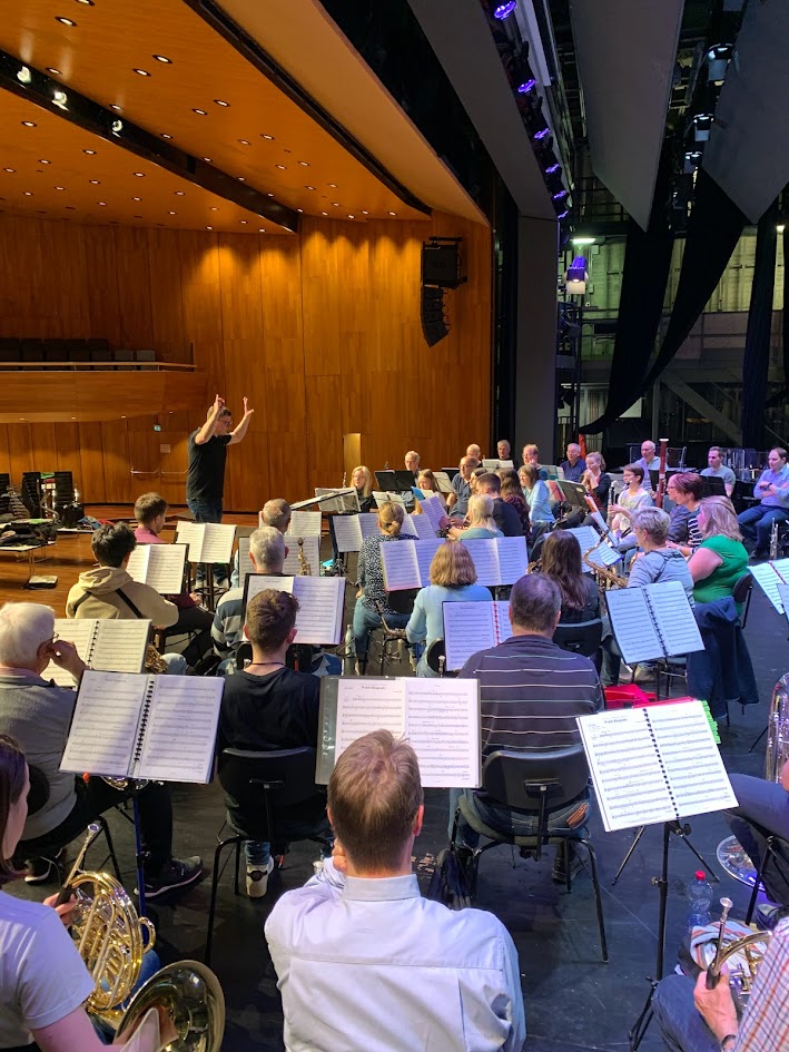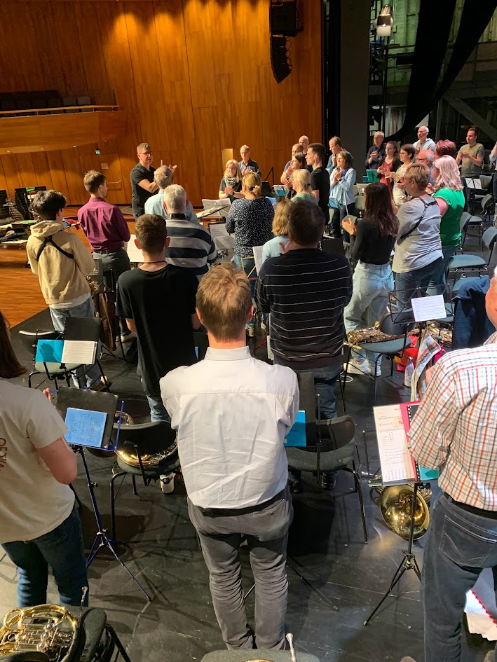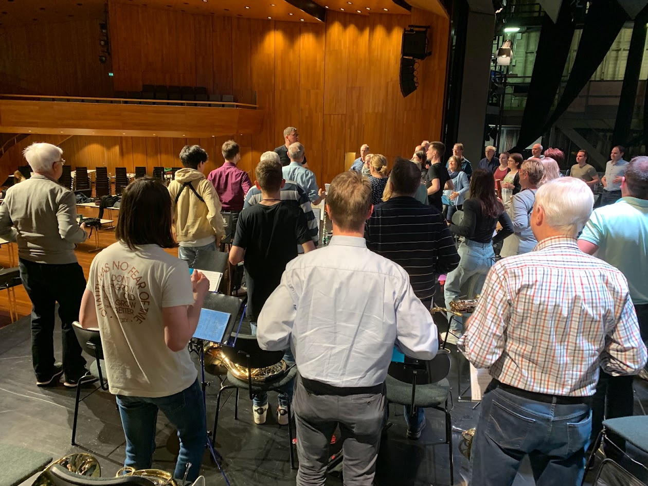 Wir durften einer Probe auf der Bühne des Konzertsaales, wo in zweieinhalb Wochen die Aufführungen stattfinden werden, beiwohnen. Auffallend: Peter Schmid macht mit dem Korps zu Beginn Lockerungsübungen wie treten und klatschen. Dazu kommen kleine Intonationsübungen, aber kein Einstimmen.