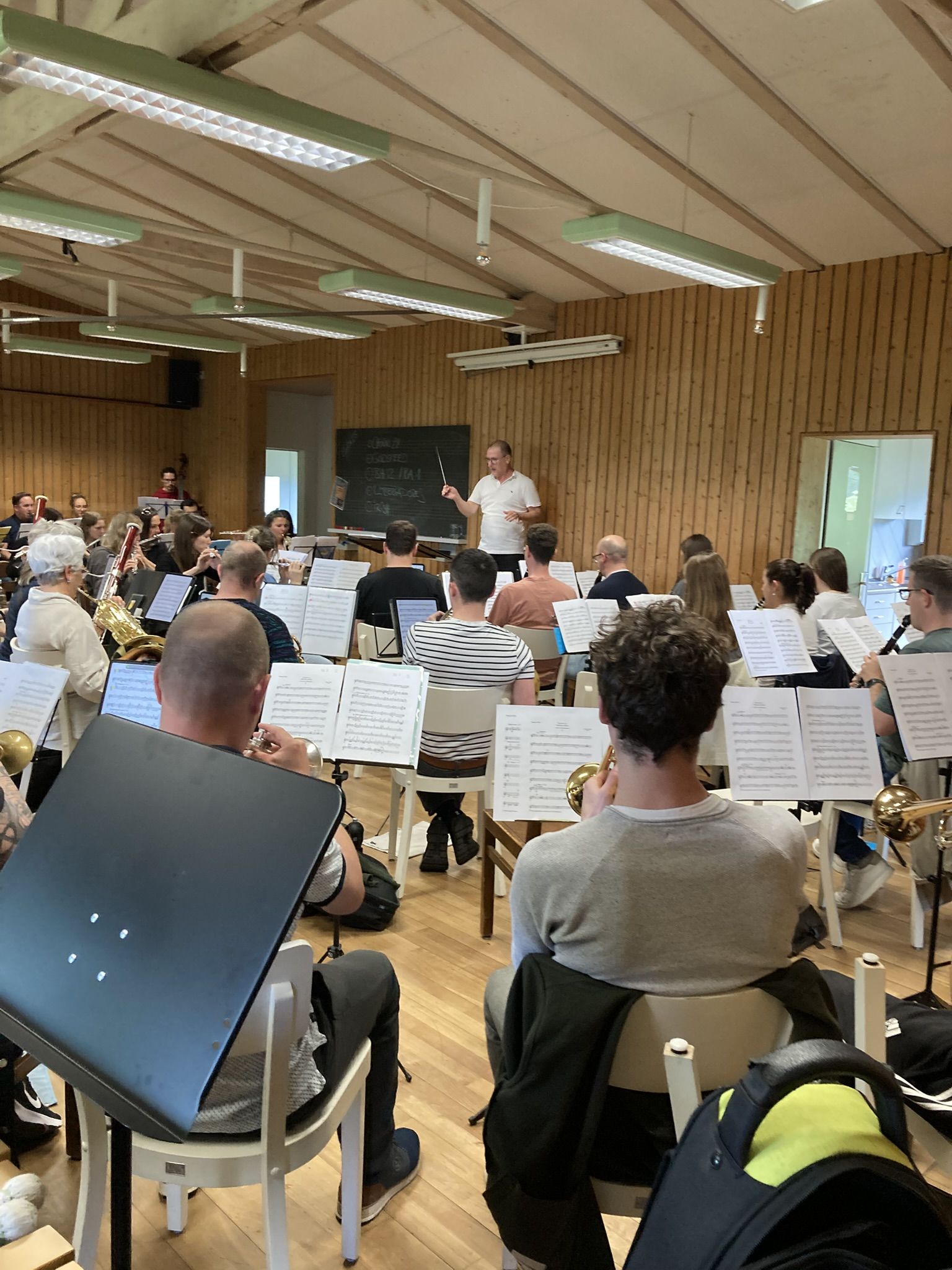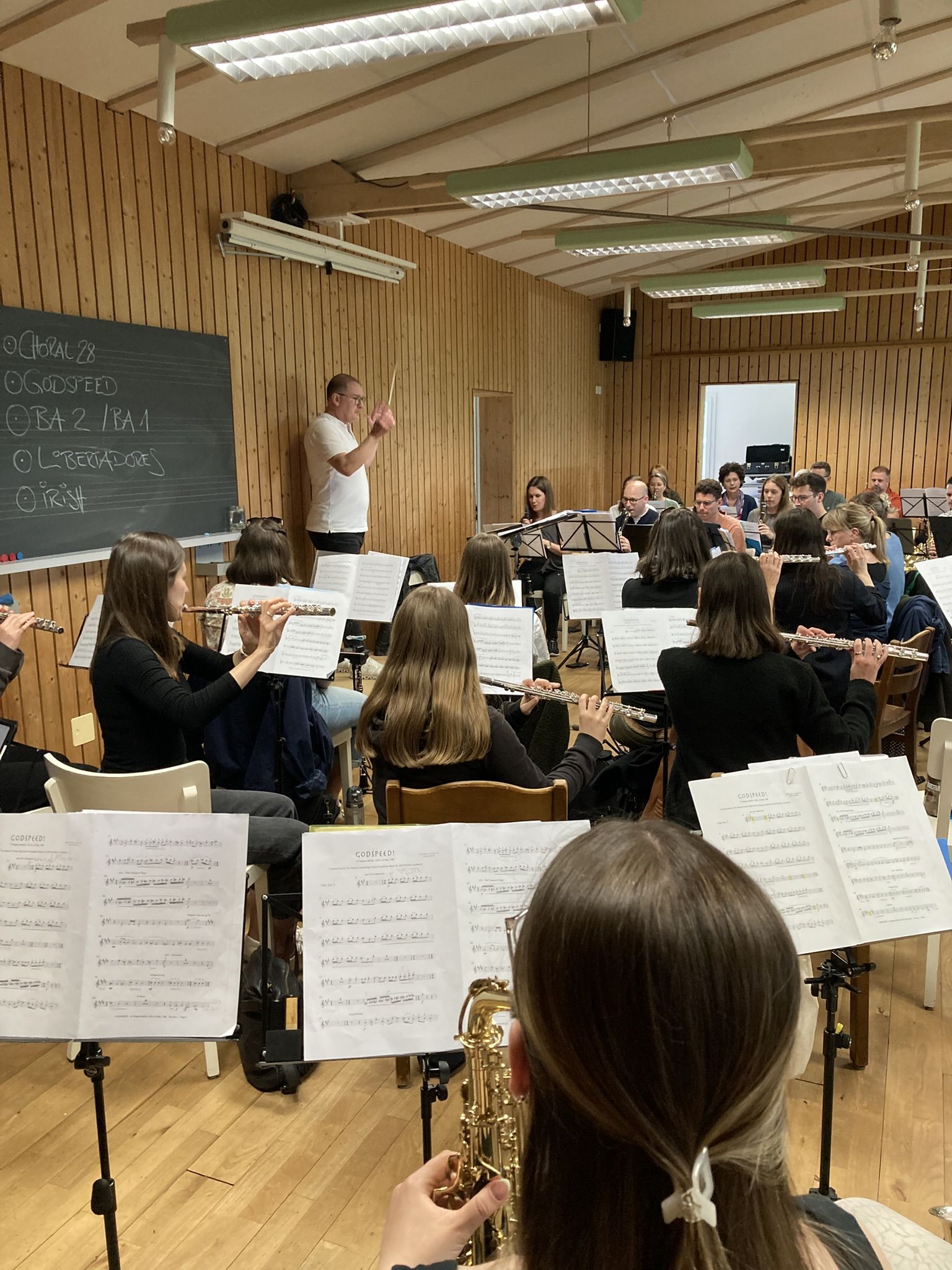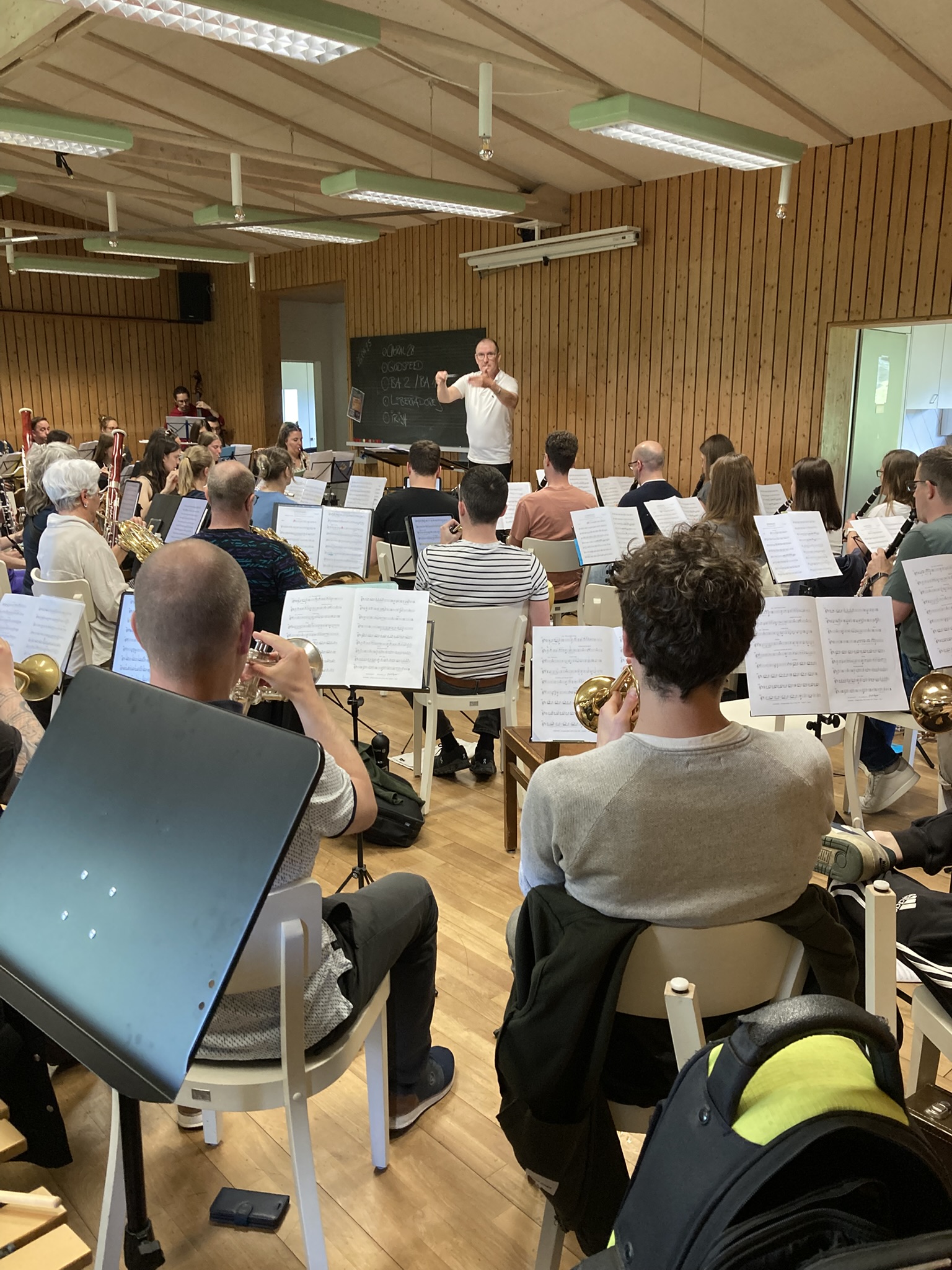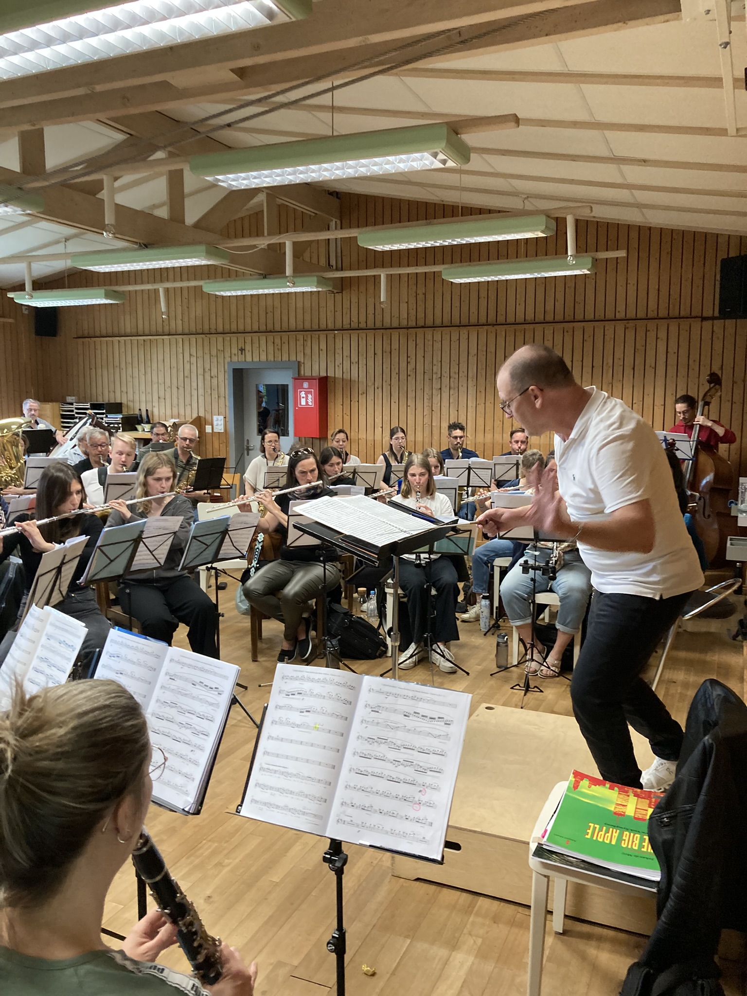 Insbesondere die besonderen Passagen für die Spezialinstrumente wie das Piano oder das Cello sind im Fokus gestanden. Dabei hat Daniel Ritter die Musikantinnen und Musikanten stets motiviert und gestärkt. Unter recht anspruchsvollen Bedingungen im Probelokal, in welchem das Korps knapp Platz hat, ist sehr effizient gearbeitet worden. Man hat sofort gemerkt, dass das Orchester sich diese Probeintensität gewohnt ist. Trotz der hohen Intensität und dem sehr anspruchsvollen Programm – «The Big (Apel) Apple» von de Meij, «Godspeed» von Melillo, «Libertadores» von Navarro und «Irish Ouverture» von Rennert – hat die ganze Probe eine sehr gute und lockere Stimmung geherrscht.